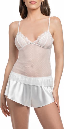 Dial up the bedtime romance as you slip between the sheets in these flirty pajamas featuring a sheer lace camisole and slinky satin shorts.