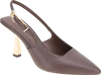 A square-cut topline and pointy toe bring crisp angles to a faux-leather pump featuring a lustrous metallic heel and buckled slingback strap.