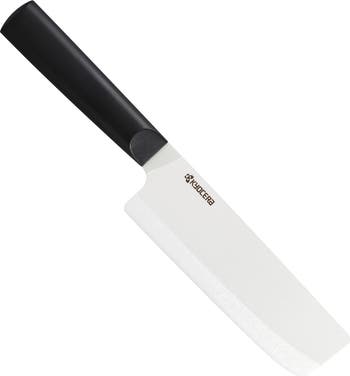 Kyocera s INNOVATIONwhite knives feature a seamless handle design with a better grip for different cutting techniques. The handle gradually thins to the blade, with a tight seam for finger grip. The circular underside of the handle and slightly thicker ends prevent the knife from dropping when hands are wet. The knives weigh half as much as their metal counterparts, making them easy to use and control which helps improve your cutting skills in home cooking. The 6" Nakiri knife is a large, wide-bladed, ergonomic knife with a non-corrosive patented blade. It is perfect for chopping piles of herbs, vegetables, or boneless proteins, and can also be used to scoop food off of a cutting board and move it to a sauté pan.
