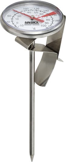 The Maverick Instant Read Beverage and Frothing Thermometer indicates the optimal temperature range for frothing milk on the dial display and features a stainless steel pot clip for safe hands-free measuring. The durable stainless steel design is built to last and the large easy-to-read display will measure Fahrenheit and Celsius temperatures.