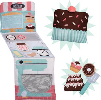 Get ready to bake up some fun! Let your child’s imagination rise with our fun-filled Bakery Folding Pillow Playset. This clever decorative pillow easily unfolds into a sweet world of make-believe baking. Folded up into a cute pillow cupcake with pink pom pom trim it is 14 inches by 14 inches and is made in a soft microfiber material. When fully opened the set is 14 inches by 46 inches, and perfect for placing over a sofa or chair for play. Separate pieces include a yummy chocolate cake with cherries, icing, and sprinkles, one cupcake with pink, white, and chocolate icing, one donut with sprinkles and chocolate icing, and one spatula for moving these goodies around. Your little one can store the chocolate cake in the mesh pocket on the cake stand. The middle section features two donuts on a silver tray plus one play donut to put on the tray along with one play cupcake to add to the top of the kitchen scale. All items are easily moved around with the spatula. A large mixer is at the bottom and the bowl is silver gray minky which can easily store any of the play pieces. This set is machine washable except for the spatula which is spot clean only.