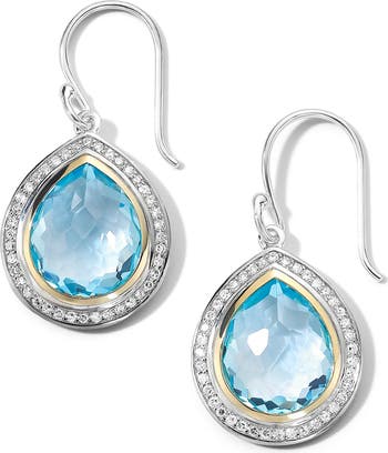 Beautiful blue-topaz stones and sparkling diamond accents elevate charming earrings fashioned from bright sterling silver with a bezel of 18-karat gold.