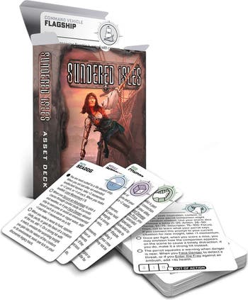 IRONSWORN: STARFORGED - SUNDERED ISLES - ASSET DECK - Sundered Isles offers a vast array of new character assets for the seafaring setting, many of which are also usable in your Starforged spacefaring campaigns. Mix-and-match assets from Sundered Isles and Starforged for limitless possibilities! This high-quality deck of poker-sized cards includes 61 assets. The laminate finish is suitable for use with dry-erase markers. For 2+ players lasting between 60-120 minutes. INCLUDES: 61 Poker-sexed cards (1 Command Vehicle (Flagship), 1 Incidental Vehicle (Sailing Ship), 16 Modules, 4 Support Vehicles, 25 Paths, 9 Companions, 5 Deeds). EXPANSION: A copy of Ironsworn: Starsworn is recommended for play. In Ironsworn: Starforged, you are a spaceborne hero sworn to undertake perilous quests. You will explore uncharted space, unravel the secrets of a mysterious galaxy, and build bonds with those you meet on your travels. Most importantly, you will swear iron vows and see them fulfilled—no matter the cost.