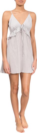 Dainty ruffles detail this all-cotton sleep chemise with a plunging V-neck finished with a drawstring tie to adjust the fit.