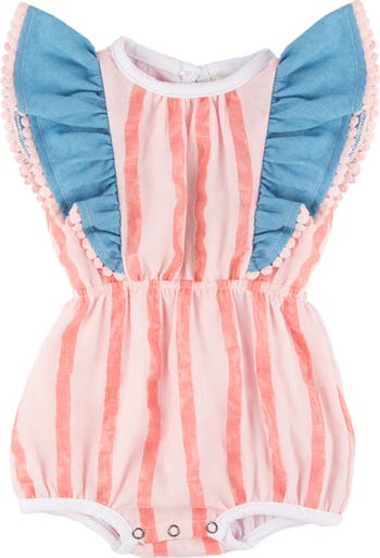 Baby will stay cool and look cute on hot days in this bubble romper featuring ruffled cap sleeves and snaps between the legs for easy changes.