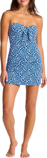 A shell-inspired print brings getaway-worthy style to a shoulder-baring bandini top made from quick-drying fabric with built-in sun protection.