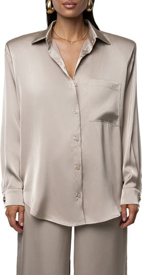 Cut from glossy skin-skimming satin, this polished shirt is framed by dropped shoulders for a relaxed fit and finished with a curved shirttail hem for easy tucking.