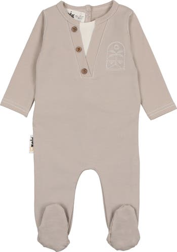 A sunny palm tree is embroidered on this henley-inspired footie made from a soft cotton blend sure to keep baby comfy and cute.