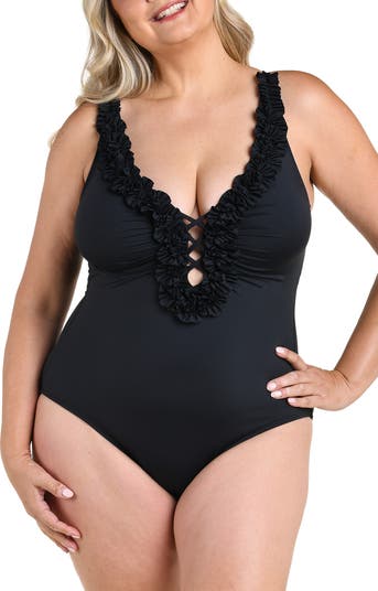 Ruffles trace the bust of this shaping one-piece swimsuit made with built-in compression and removable cups.
