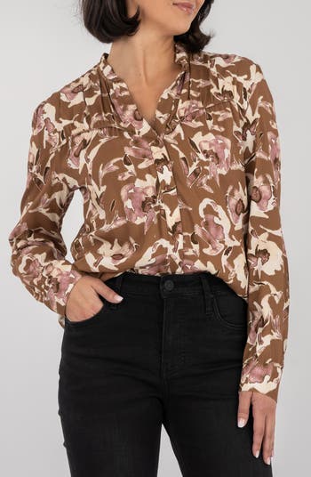 A blurry floral print in understated hues covers a lightweight crepe shirt that s refined with a ruffled mini collar and neat piping at the curved yoke.