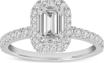 LuvMyJewelry s iconic halo ring features a 1.75 ct. emerald cut center lab grown diamond and round cut lab grown side diamonds set in 14K gold with a four prong setting. The ring is accompanied with an IGI certificate with the certificate number inscribed within the band. Diamond carat weight may fluctuate 0.05 carats ABOVE the stated number.