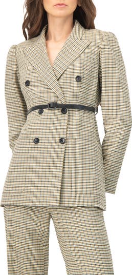 Double-breasted blazer featuring patch pockets and a belt.