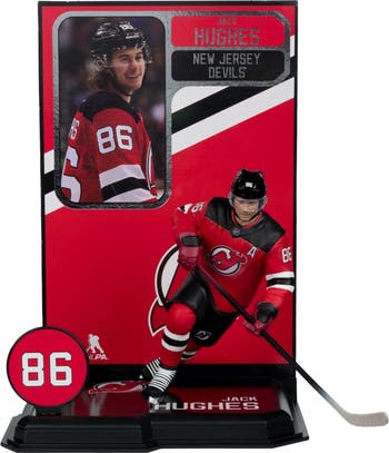 Jack Hughes (New Jersey Devils) McFarlane NHL 7" Figure. Jack Hughes, selected No. 1 overall by the New Jersey Devils in the 2019 NHL Draft, is the USA Hockey National Team Development Program’s all-time leader in assists (154) and points (228). He broke out in 2021-22 with 56 points in 49 games and, in 2022-23, became the first Devils player in over a decade to score 40 goals, finishing with a franchise-record 99 points. Hughes is the fastest player in franchise history to reach 300 points (325 games) and has been named an NHL All-Star twice (2022, 2023). He holds multiple tournament records at the IIHF World Under-18 Championship and has skated alongside both of his brothers, Quinn (Vancouver Canucks) and Luke (Devils), in the NHL.