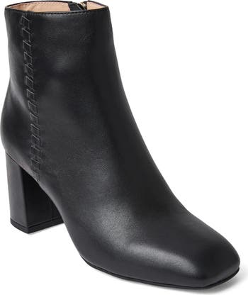 Whipstitched trim brings signature style to the side of a sleek leather bootie balanced by a block heel and square toe.
