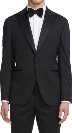 Sophisticated peaked lapels frame a classic tuxedo jacket crafted from luxe Italian wool with beautiful satin trims.