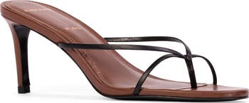 Ultraslim leather straps bring a barely there look to this thong sandal elevated on a setback stiletto heel.