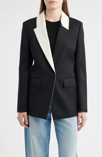 Perfectly balance the line between practicality and modern allure in this wool blazer boasting an asymmetric stripe of color on the lapel.