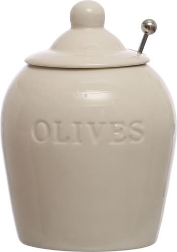 - Enhance every kitchen storage with this 4-inch round debossed stoneware jars, each features a charming debossed design engraved with the word "Olives" and comes with a stainless steel slotted spoon