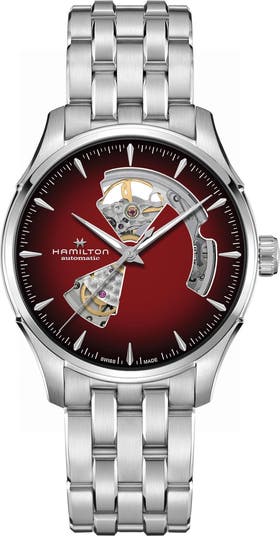 Intriguing cutouts in the sunray dial allow a glimpse of the inner jewels and precision automatic movement of a finely crafted Swiss timepiece set on a polished bracelet.