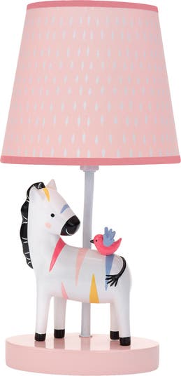 This custom hand-painted lamp is made of a 3-dimensional resin zebra. The total height of the lamp with shade and bulb is approximately 14”. The sculpted zebra has a cute little pink bird on her back. She is white with colorful stripes. Her eyes, mane, muzzle, feet, and tail are black, and her cheeks are pink. The peach lamp base is an oval shape. The lamp comes with an energy efficient light bulb (equivalent to 60 watts).