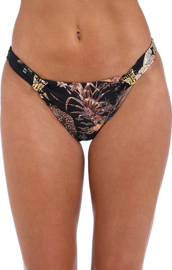 Gleaming leopard hardware amps up the jungle theme of high-leg bikini bottoms cut with moderate back coverage.