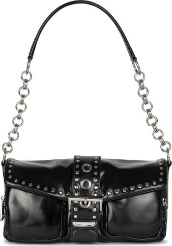 Gleaming studs and metal grommets create an edgy aesthetic on a pocket-packed shoulder bag rendered in rich leather that will complement your bold looks.