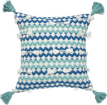 The Jensen Pillow features ochre, surf, indigo, and grey and beige yarn woven into a fun zigzag design. Large corner tassels and additional wrapped yarn accents give this ladder woven throw pillow an informal feel that fits right in with today s on-trend design styles.