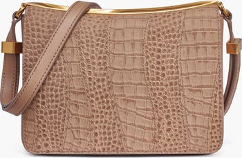 Realized in a structured silhouette, this crossbody by Donna Karan is crafted in leather and accented with bright gold-tone hardware and logo.