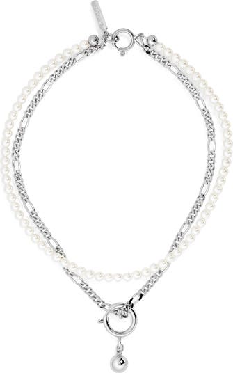 A spring-ring pendant with ball charm anchors this handmade necklace featuring a strand of glossy faux pearls and a figaro chain for an effortless layered look.