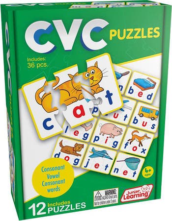 CVC PUZZLES - Make early reading fun and interactive with Junior Learning CVC Puzzles! Designed to teach children Consonant-Vowel-Consonant (CVC) word patterns, these self-correcting puzzles help kids understand how letters come together to form simple words. Each puzzle consists of three jigsaw pieces that represent a consonant, vowel, and consonant. As children connect the pieces in the correct order, they build a word and reveal a vibrant matching image, reinforcing both spelling and word meaning. As children connect the pieces, they reinforce phonemic awareness, blending skills, and early spelling. Each puzzle piece features color-coded letters blue for consonants and red for vowels to help children visually distinguish letter types and positions within a word. This simple yet powerful visual support reinforces phonics concepts and makes learning word patterns easier to understand. When a puzzle is completed, it reveals a bright, engaging image that visually represents the CVC word. This set includes 36 puzzle pieces (12 completed puzzles) with color-coded letters blue for consonants and red for vowels to help young learners visually distinguish letter types and their positions in the word. Each puzzle is made from sturdy, child-safe materials designed to withstand repeated use in classrooms, homes, or early learning environments. Perfect for ages 4+, these puzzles are ideal for early literacy centers, phonics instruction, or home learning fun.