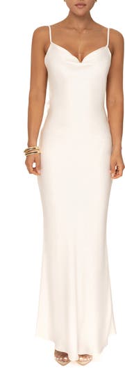 Slinky meets stunning in this chic gown cut from liquid satin and detailed with flower-embellished straps across the revealing back.