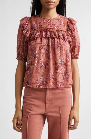 Pairing airy elegance with standout texture, this romantic silk-blend top is framed by voluminous puffed sleeves and delicate pleated ruffles. A metallic-flocked botanical print adds subtle shimmer and dimension.