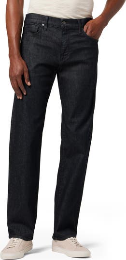 A dark wash with minimal fading brings a sleek, selvedge-inspired look to classic straight-leg jeans made from lightweight stretch denim.