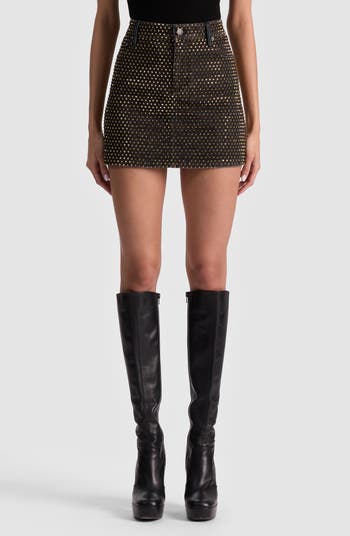 High-shine studs add disco-inspired elevation to this inky-wash jean skirt cut in a leggy length.