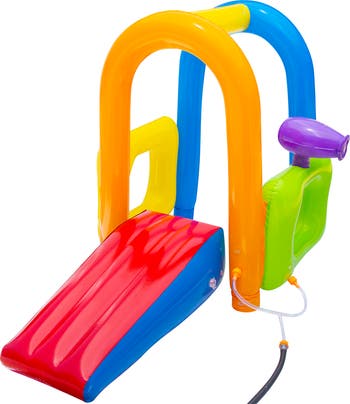 Why should just the big kids have all the fun? Little ones will slide, splash and blast into refreshing backyard fun with the Banzai Jr. Splash Fun Water Park! Have a blast with the inflatable continuous water-sprinkling cannon, take a dip down the inflatable sliding ramp, or splash and play under the gentle sprinkles. The continuous water-sprinkling inflatable arch keeps the sliding ramps surface wet and slick for added fun. The removable inflatable sliding ramp is water weighted for added stability. Easily attaches to any garden hose. Make it a summer of fun with this all-in-one backyard water park! Recommended for ages 18 months and up.