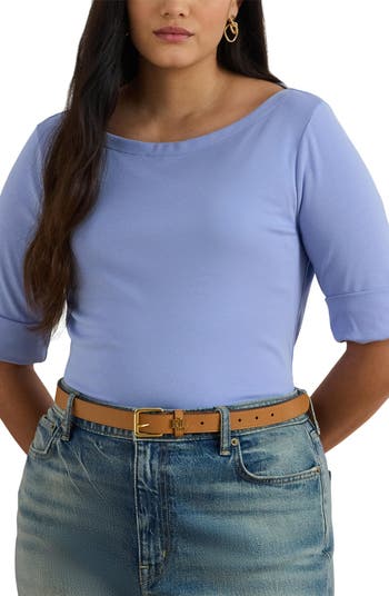Designed with a refined boat neckline and neat elbow-length sleeves, this top feels streamlined and versatile. The stretch-cotton knit stays comfortable and smooth, holding its shape while keeping your look sharp.