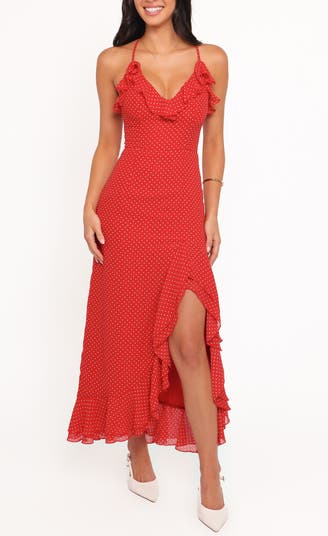 Sprinkled with party-perfect dots, this figure-skimming maxi is made with fluttering frills and finished with a leg-baring side slit.