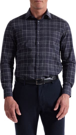 Tailored from soft, stretch-enhanced cotton, this plaid shirt features a crisp collar and a lower hem that stays tucked and looks great if you leave it hanging out. Button the adjustable cuffs for everyday or use your own cuff links to add an elevated-casual finish.