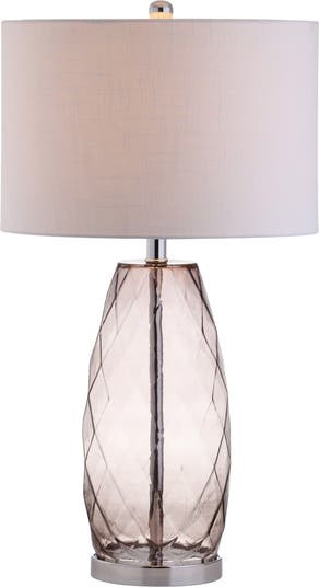 A tint of Moroccan Blue emphasizes the beautifully faceted shape of this glass table lamp, reminiscent of precious gemstones. Subtly stylish and simultaneously classic, the chrome base and finial add modern touches to an elegant base. We love how the designer touches extend all the way to the plug with a silk-wrapped cord.