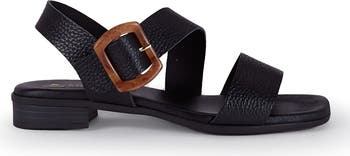 A modern sandal detailed with wide straps and a bold buckle accent that adds a touch of sophistication to any outfit. Made in Spain.
