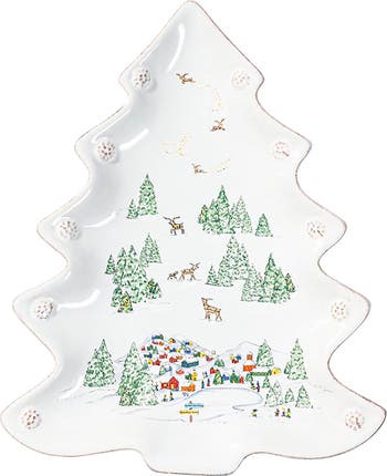 Juliska s iconic Berry and Thread motif details a tree-shaped ceramic tray that s hand-illustrated with festive holiday scenes of Santa s North Pole.