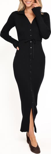 A slim waist tie adds definition to this cozy sweater-dress knit in a curve-hugging maxi silhouette with soft ribbing so you move through the social season in style.