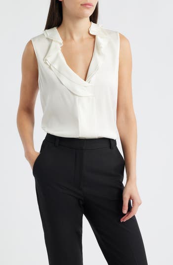 Double-layer ruffles flutter from the V-neck of a sleeveless stretch-silk top finished with side vents for an insouciant untucked look.