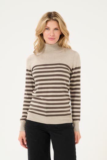 The KAlizza pullover is a stylish and timeless knit top with horizontal stripes. It has a soft roll neck and a slim fit, and the fabric is soft and stretchy. The sleeves are long with a straight fit, and the pullover is cut at the hips.