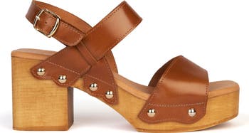 Gleaming midsole studs and a rich leather upper distinguish a retro-inspired sandal lifted by a woodgrain platform and block heel.