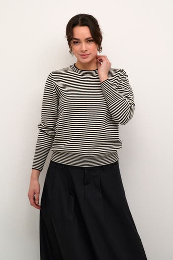 The KAnala pullover is a simple everyday top that will look great with both pants, jeans, and a skirt. It has a round neck and a regular fit, and it is made in a tight knit fabric with narrow stripes. The sleeves are long with a wide knit cuff, and all the edges are finished with a rib knit.