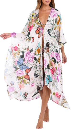 Dial up the poolside drama with a flowing chiffon cover-up trimmed in sequins and covered in a bounty of blooms and butterflies.