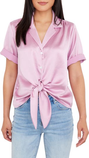 Glinting mother-of-pearl buttons give beautiful detail to this lovely satin blouse perfected by polished rolled cuffs.