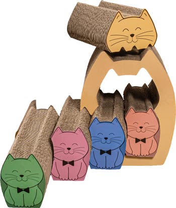 Keep your cats active and healthy with our five-piece scratch and play set. The adorable cat family design is made from corrugated cardboard that kitties love. Simply pull out separate kitten scratchers to create a play tunnel for stalking or hiding out.