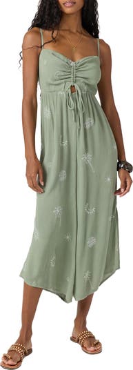 Flowy wide legs adds beach-worthy vibes to this crinkle-textured jumpsuit designed with a peekaboo cutout at the bodice and a boho-inspired embroidery.